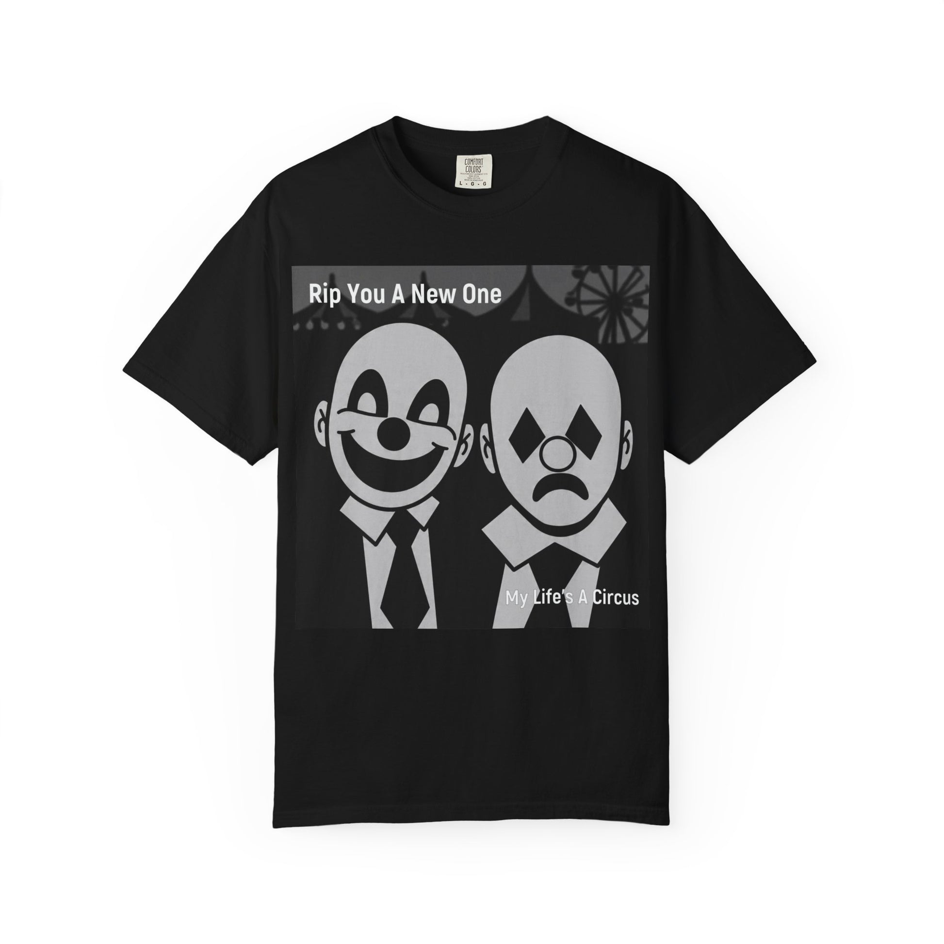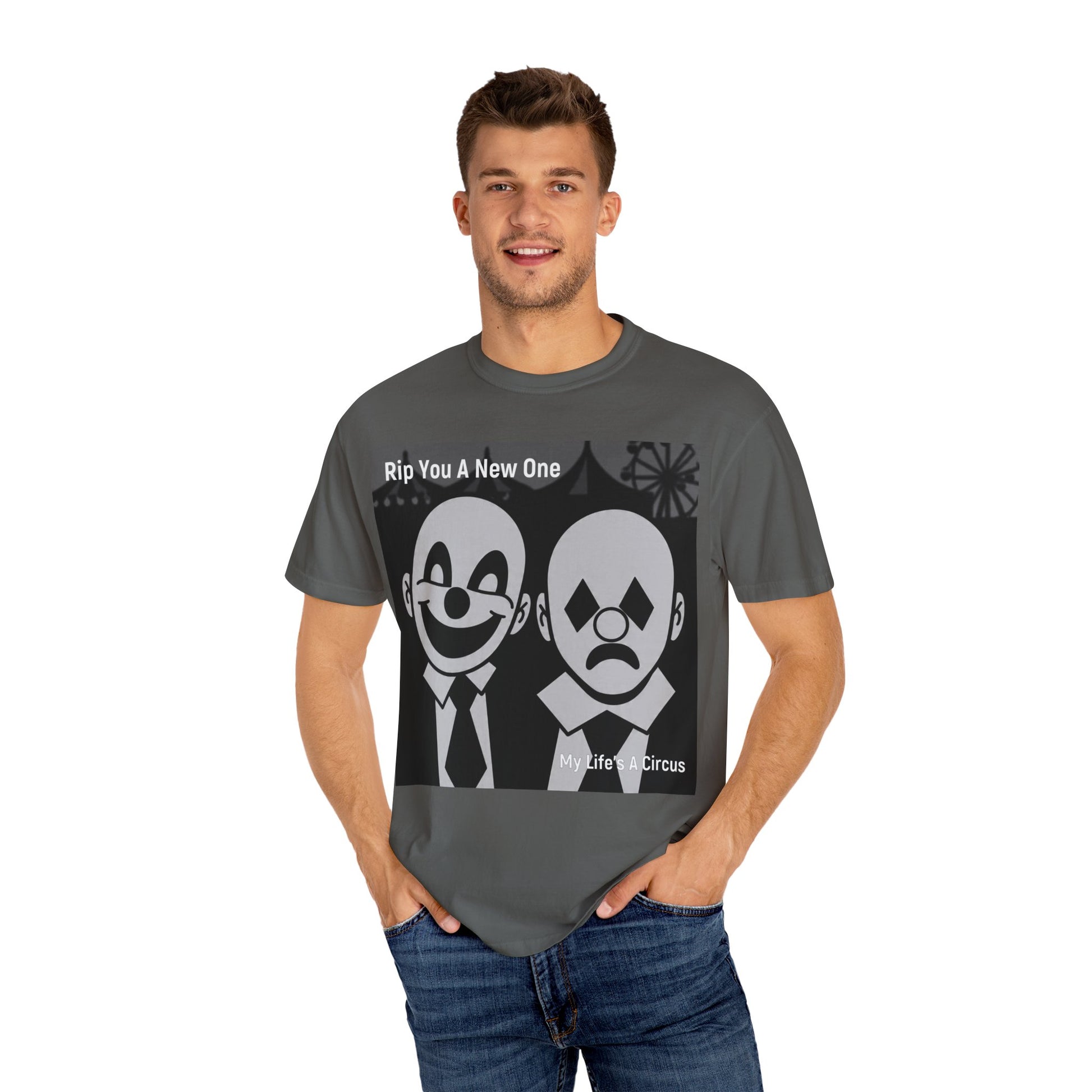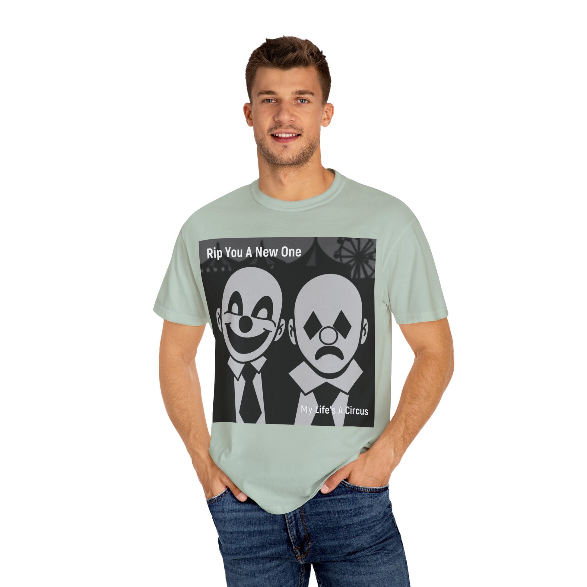 'My Life's A Circus' by Rip You A New One, Clown-Themed Unisex T-Shirt, Quirky Graphic Tee, Funny Gift for Theatre Lovers, Unique Casual Wear, Statement T-shirt, Humor Apparel, Sad and Happy Faces