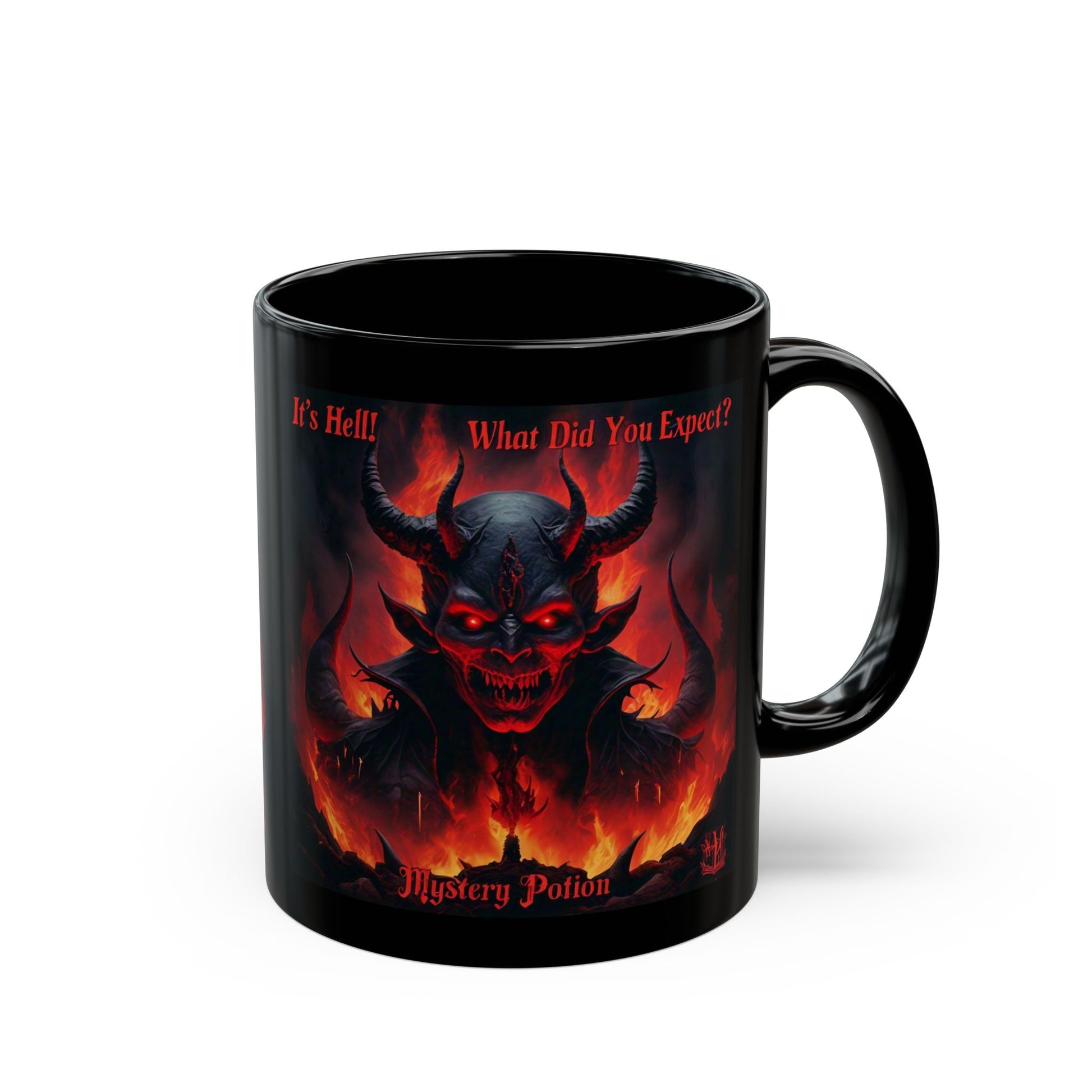 It's Hell! What did you expect? Introducing a stylish and bold black mug, perfect for those who appreciate a bit of edge in their morning routine. With its glossy finish and striking design, this mug exudes a mysterious vibe that complements any coffee or tea ritual. Ideal for home or office use, it’s also a great conversation starter. Designed for adults, this mug makes an excellent gift for friends and loved ones who enjoy unique, eye-catching accessories. Perfect for occasions like Halloween, birthdays, or just to make everyday moments a little more exciting.