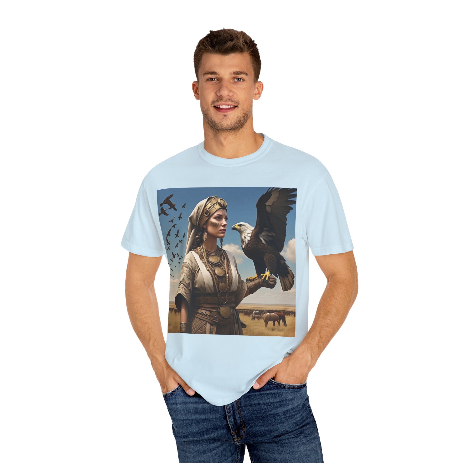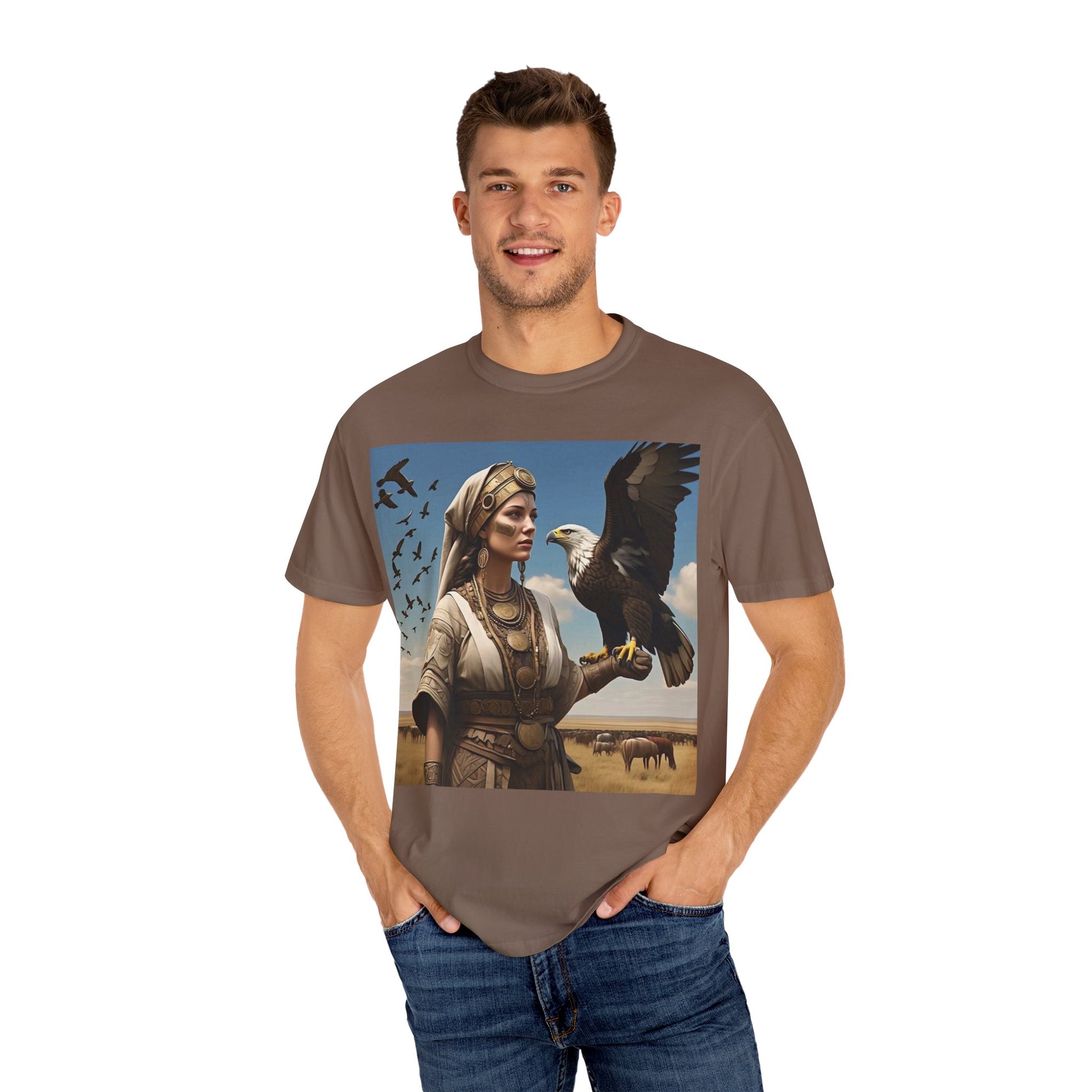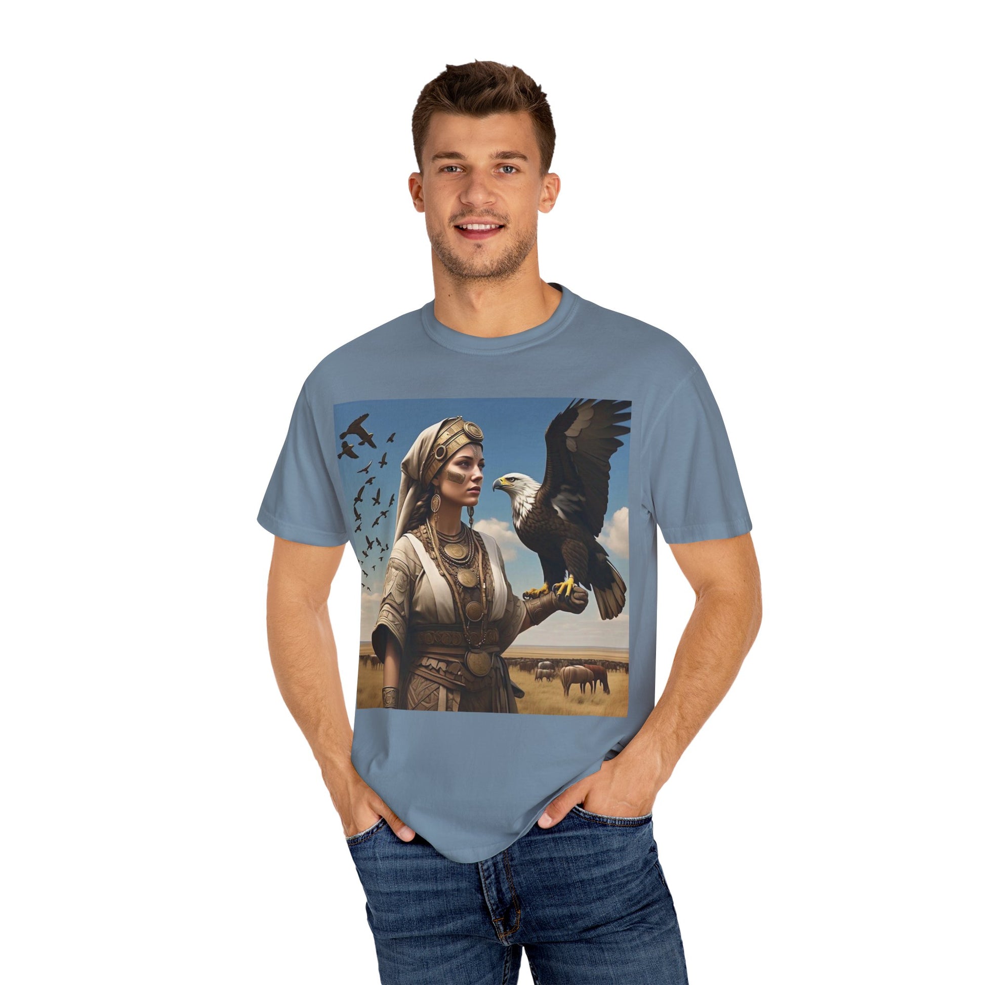 Empowered Eagle and Scythian Woman T-Shirt, Unisex Garment-Dyed Tee, Nature Lover Shirt, Gift for Bird Enthusiasts, Unique Graphic Tee