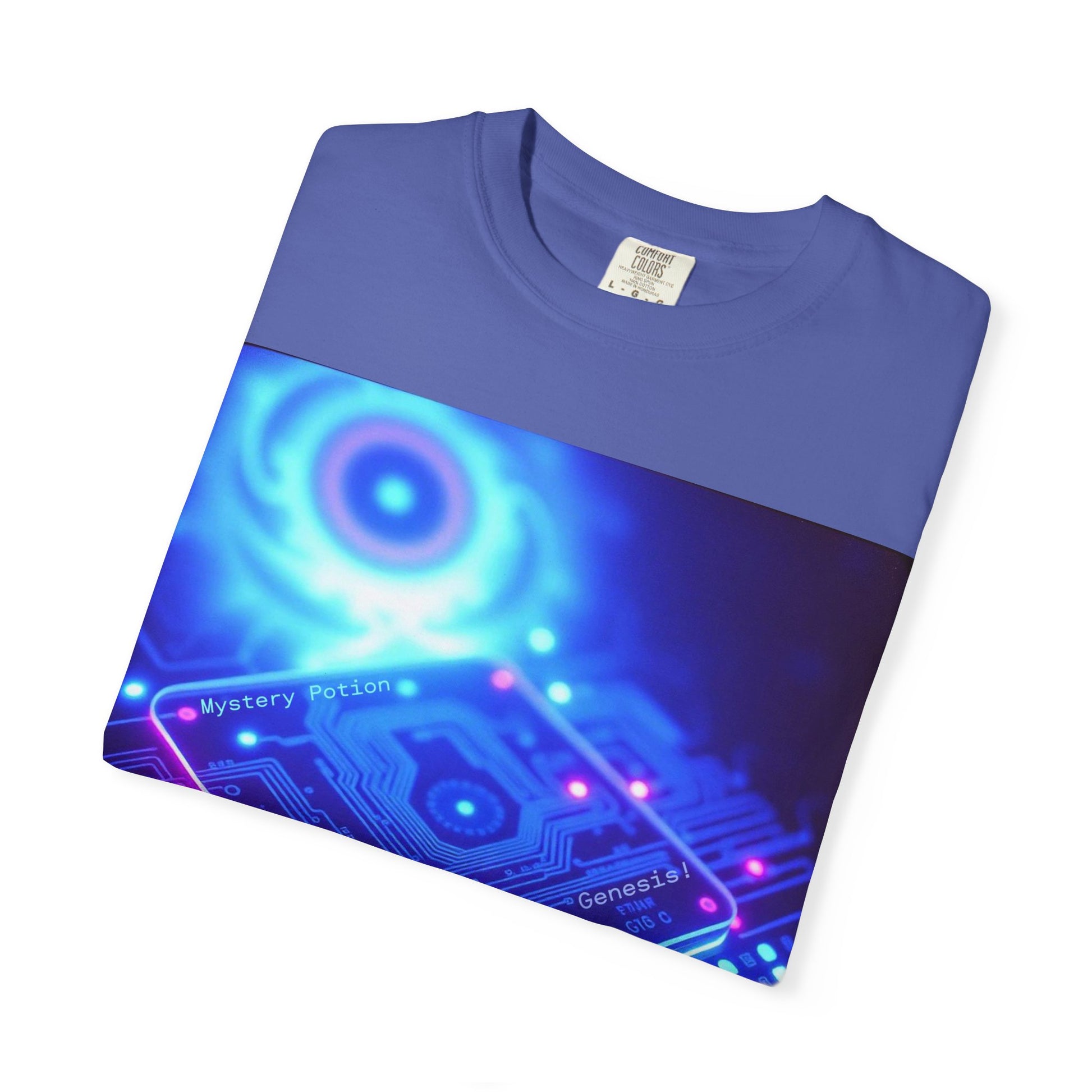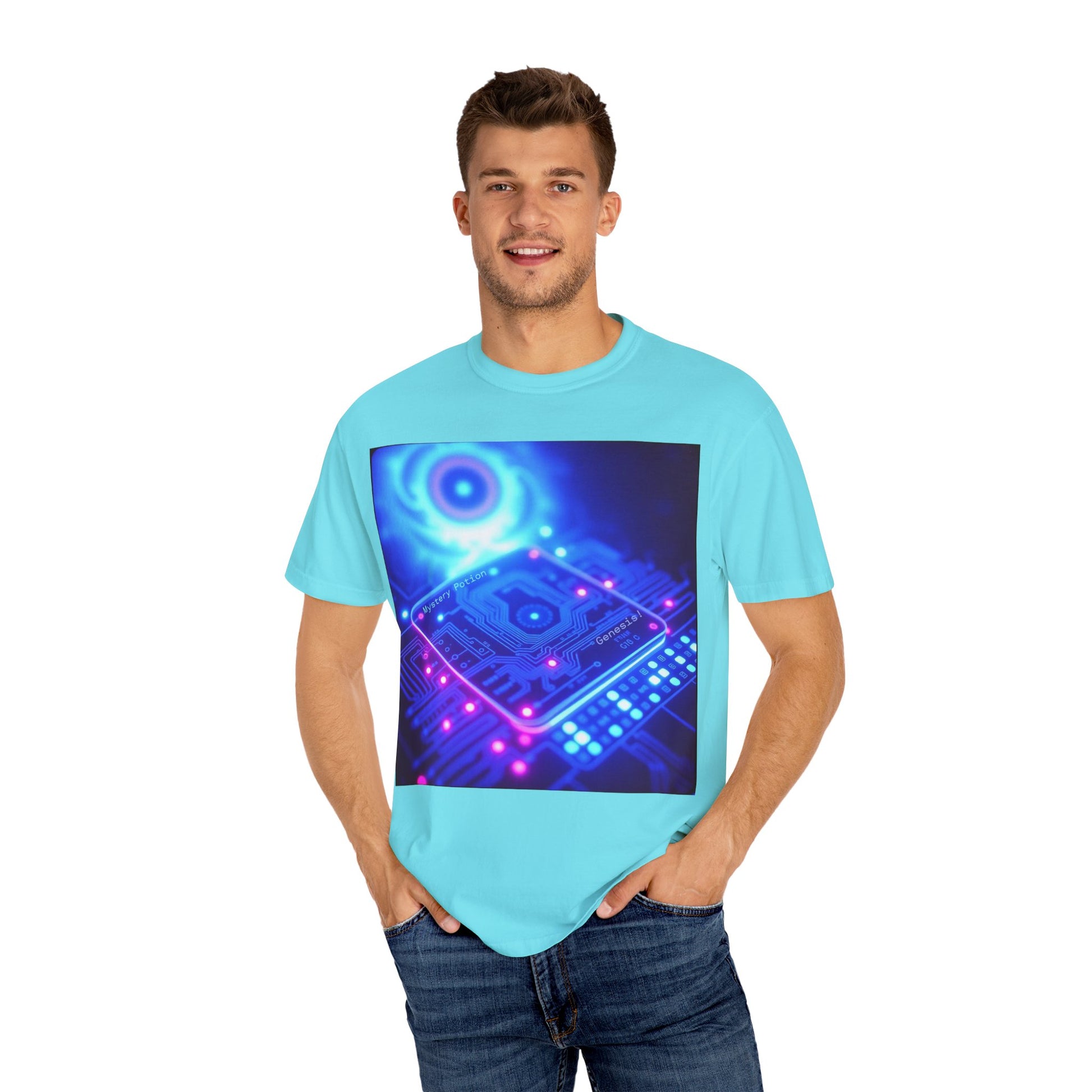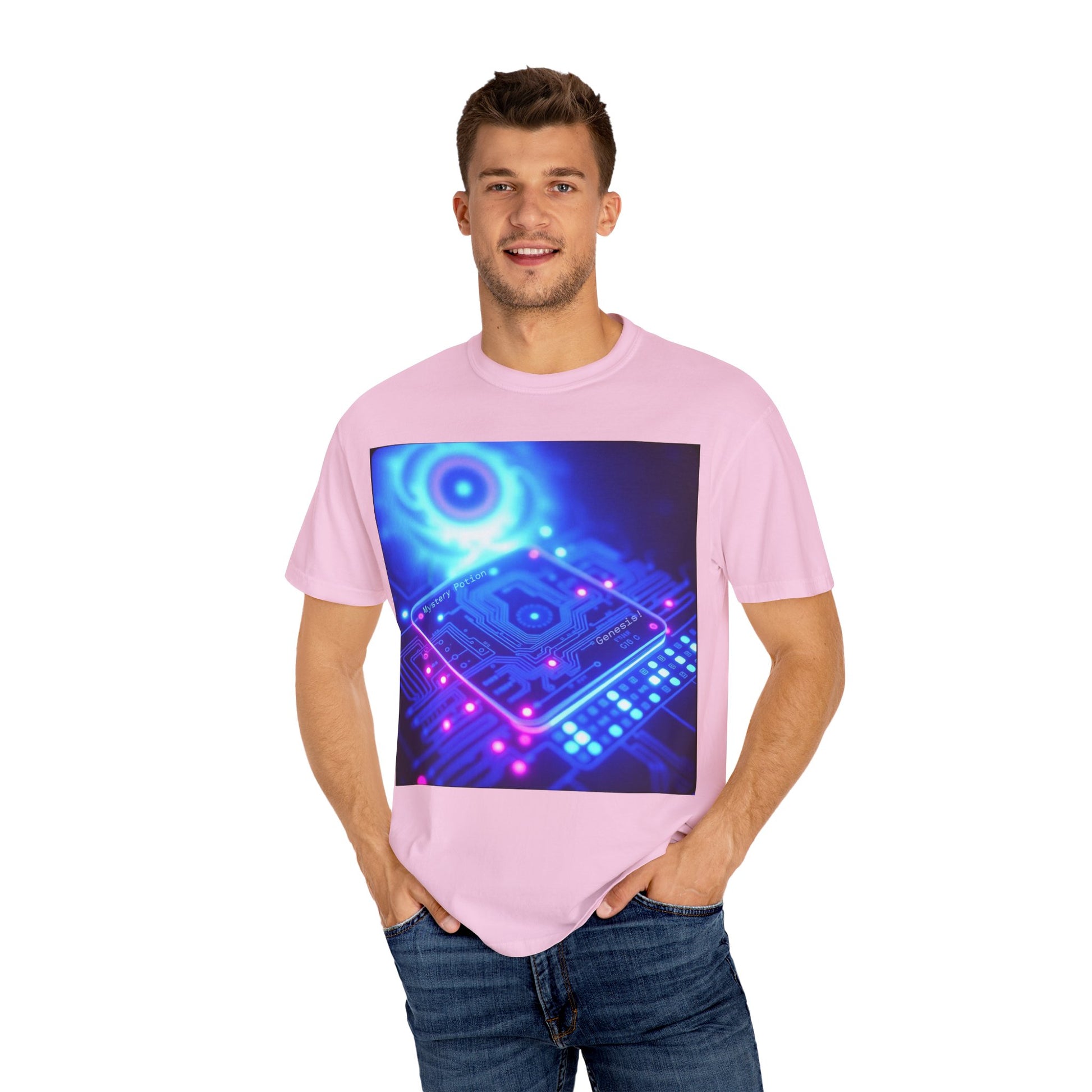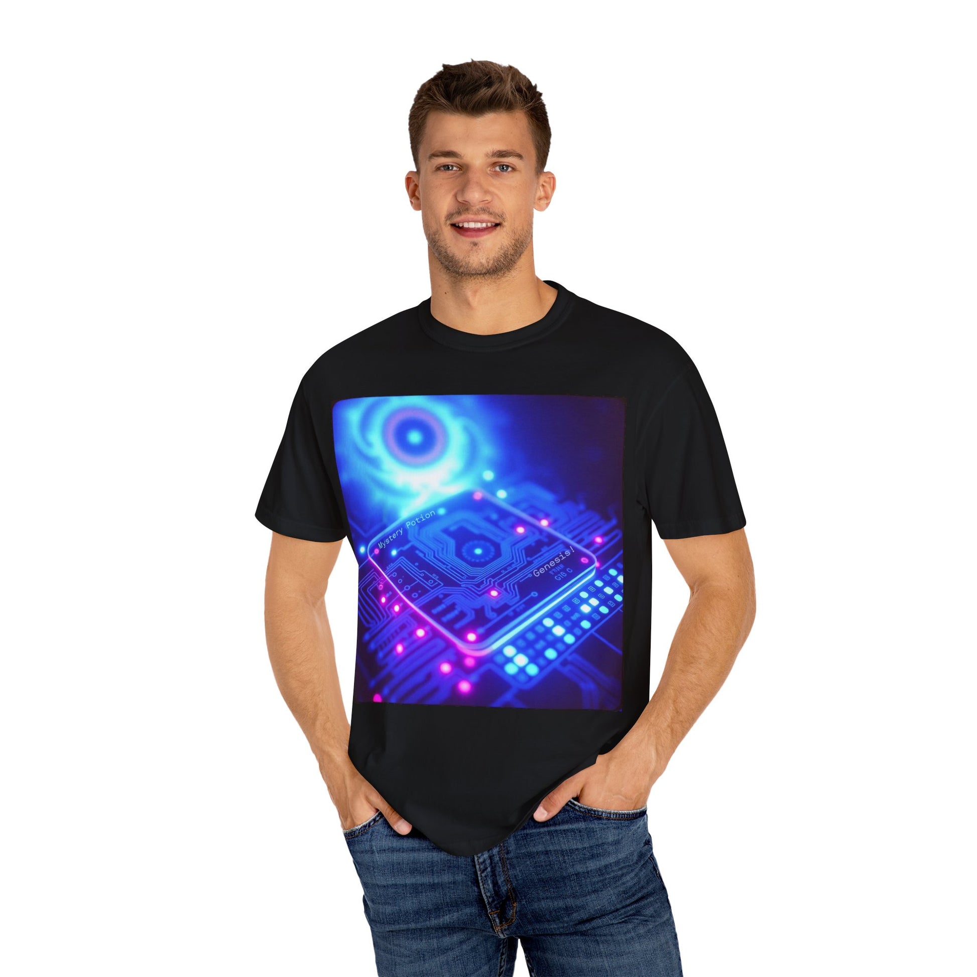 Genesis by Mystery Potion, Tech-Inspired Unisex Garment-Dyed T-Shirt, Unique Gift for Tech Lovers, Festival Wear, Casual Style, Gamer Apparel, Cyberpunk Vibe