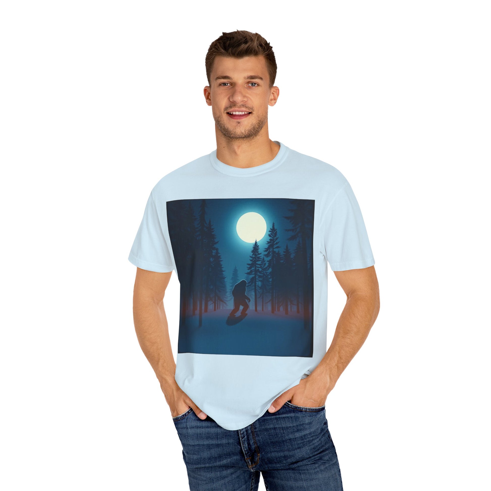 Moonlit Forest Snowboarder T-Shirt, Cozy Adventure Tee, Winter Sports Gift, Unisex Apparel, Outdoor Vibes