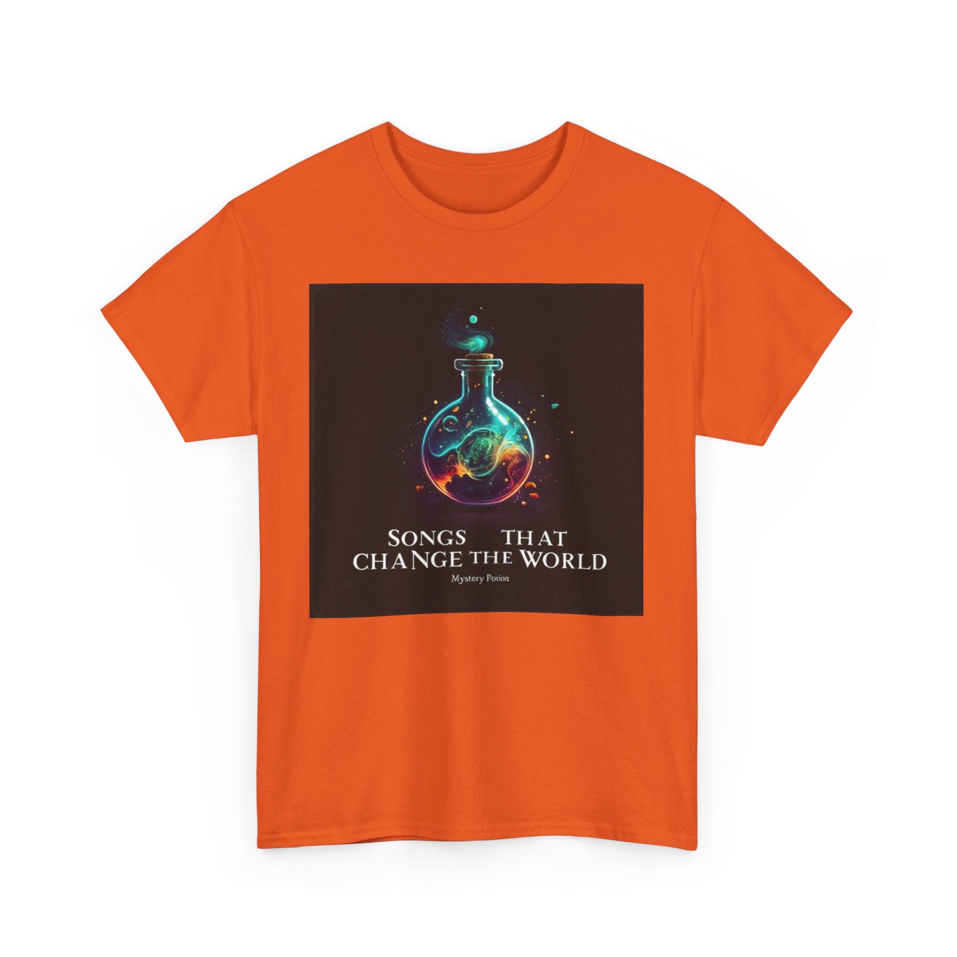This Tee features a unique design of a Mystery Potion lab bottle containing the Mystery Potion Aqua, Orange, Purple, and white on a Black background with the words 'Songs That Change The World'. The classic fit ensures a comfy, relaxed wear while the crew neckline adds a timeless look. Perfect for adults looking for a comfortable and stylish tee for everyday wear or special occasions. Ideal for music lovers, fantasy enthusiasts, and Halloween celebrations.